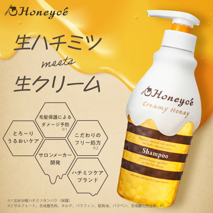 Honeyce’(ハニーチェ)は、サロンメーカーが開発した髪と肌を想うハチミツヘアケアブランドです。「生ハチミツ meets 生クリーム」をコンセプトに、厳選された美容成分を贅沢に配合した製品を提供しています。特徴的なパッケージデザインと、甘くとろけるような使用感で、多くのユーザーから支持を受けています。