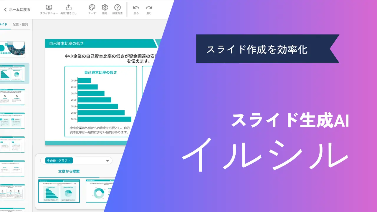 イルシル(ILCIL)は、AIを活用してスライド資料を自動作成できる革新的なツールです。ビジネスシーンにおいて必要不可欠なプレゼン資料や社内用の説明スライドを、わずか数分で完成させることが可能です。文章を入力するだけでデザイン性の高いスライドに変換されるため、資料作成にかかる時間を大幅に削減できます。特に、毎日のようにプレゼンやレポート資料を作成するビジネスパーソンや、短期間で効率的に成果物を用意したい方にとって心強い味方となります。